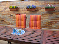 Habe jetzt die Woche über fleißig an der Gestaltung unserer Terasse gewerkelt, Tisch und Stühle abgeschliffen um sie dann anschließend zu ölen (das spanische Teaköl ist viel besser als das deutsche) , Blumen pflanzen etc. Aber wie ihr sehen könnt hat sich die Arbeit gelohnt ;-)